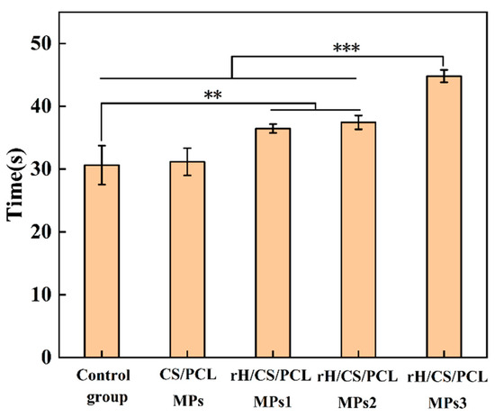 APTT of the samples: Control group, CS/PCL MPs, rH/CS/PCL MPs1, rH/CS/PCL MPs2, rH/CS/PCL MPs3, n = 3. ** p < 0.01, *** p < 0.001.