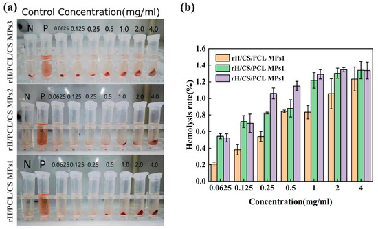 (a) Photographs and (b) haemolysis rates of rH/CS/PCL MPs at different concentrations, from 0.0625 to 4 mg mL−1, n = 3.