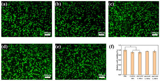 Fluorescence images of BV2 cells at 48 h: (a) PBS, (b) CS/PCL MPs, (c) rH/CS/PCL MPs1, (d) rH/CS/PCL MPs2, (e) rH/CS/PCL MPs3; scale bar: 200 μm. (f) Fluorescence image analysis of relative BV2 cell viability at 48 h, * p < 0.05, n = 3.
