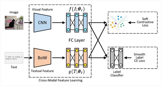 We conduct the model in the process of learning the optimal function by minimizing the soft contrastive loss and smooth label cross-entropy loss as obtained in Equations (4) and (5), where and are the optimized parameters of visual network and textual network , mathematically. As the optimization process of two networks is carried out simultaneously, the process runs as: