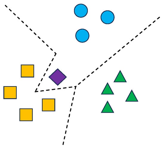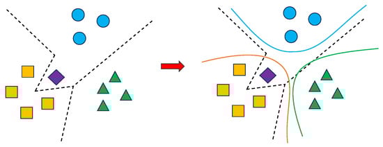 To better solve this problem, we use the soft contrastive loss to optimize the model parameters. In the process of sample mapping, the boundaries between classes become smooth. Despite it being a problem of model complexity or overtraining, soft contrast loss can help the model obtain smooth boundaries, thus greatly improving the generalization and robustness of the model as shown in Figure 4. Hence, the soft contrastive loss function is calculated by Equation (4) as follows:
