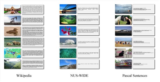 We carry out all experiments on three popular datasets, Wikipedia [], NUS-WIDE [] and Pascal Sentence [], which are introduced briefly as follows, and the statistic details of them are shown in Table 2. Besides, the image-text samples of datasets are shown in Figure 5.