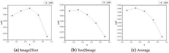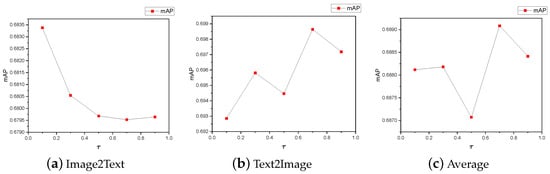 Hyperparameter . As shown in Equation (5), the hyperparameter notably affects the efficacy of SCCMR in cross-modal retrieval tasks. To substantiate this assertion, we examined the responsiveness of the hyperparameter within the NUS-WIDE datasets, considering Image2Text, Text2Image, and average performance metrics. As depicted in Figure 7, the retrieval accuracy exhibits variability with alterations in , with SCCMR reaching peak mAP when is configured to 0.3. This evidence corroborates the notion that an optimal selection is crucial for maximizing SCCMR performance.
