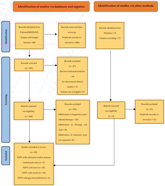 We used the following keywords in our search: “Non-surgical periodontal therapy” AND “ultrasonic devices”; “Non-surgical periodontal therapy” AND “ultrasonic scalers”; “Non-surgical periodontal therapy” AND “ultrasonic debridement”; “Non-surgical periodontal therapy” AND “ultrasonic instrumentation”; “Periodontitis” AND “ultrasonic devices”; “Periodontitis” AND “ultrasonic scalers”; “Periodontitis” AND “ultrasonic debridement”; “Periodontitis” AND “ultrasonic instrumentation”; “Periodontal treatment” AND “ultrasonic devices”; “Periodontal treatment” AND “ultrasonic scalers”; “Periodontal treatment” AND “ultrasonic debridement”; “Periodontal treatment” AND “ultrasonic instrumentation”; “Non-surgical periodontal therapy” AND “hand instruments”; “Non-surgical periodontal therapy” AND “manual instrumentation”; “Non-surgical periodontal therapy” AND “curettes”; “Periodontitis” AND “hand instruments”; “Periodontitis” AND “manual instrumentation”; “Periodontitis” AND “curettes”; “Periodontal treatment” AND “hand instruments”; “Periodontal treatment” AND “manual instrumentation”; “Periodontal treatment” AND “curettes”; “Non-surgical periodontal therapy” AND “laser”; “Periodontitis” AND “laser”; “Periodontal treatment” AND “laser”; “Non-surgical periodontal therapy” AND “ozone”; “Periodontitis” AND “ozone”; “Non-surgical periodontal therapy” AND “ozone”; “Non-surgical periodontal therapy” AND “glycine”; “Periodontitis” AND “glycine”; “Periodontal treatment” AND “glycine”; “Non-surgical periodontal therapy” AND “erythritol”; “Periodontitis” AND “erythritol”; “Periodontal treatment” AND “erythritol”. The search used a temporal range from 2013 to 2023, to analyze the most recent findings.