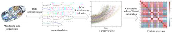 Figure 1 shows the proposed time series feature selection workflow. After obtaining the system time series monitoring data, the sensor signals are initially screened and then normalized. Afterward, in order to obtain the system target variables, PCA dimensionality reduction is performed on the normalized data to obtain one-dimensional time variables that can characterize the trend in the system operability. Then, the mutual information between each time series features with the target variable, as well as between each time series feature, is calculated. According to the value of mutual information, the time series features with large correlations and small redundancy with the target variables are selected.