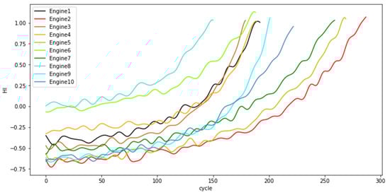 Figure 5 shows the system operability of engines from numbers 1 to 10 in the dataset. It can be seen from the figure that by extracting the system degradation curve as the target variable, the monotonicity and irreversibility of the variable can be guaranteed, and the system operability can reflect the health status of the system to a certain extent.
