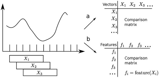 Figure 3a. However, defining a suitable measure for distance between unprocessed time series can be a difficult task. The definition must take into account various factors such as high-dimensional space, noise, varying series lengths, different dynamics, and different scales. Therefore, it is recommended to use a clustering algorithm for an interpretable, extracted feature vector; see
