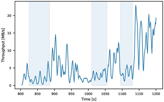 Figure 4 shows a fragment of the F2 trace with highlighted segments possessing similar statistical characteristics measured by the mean and variance. The segments were selected from a cluster identified by KMeans. The segments have low throughput and variability compared to the rest of the trace.