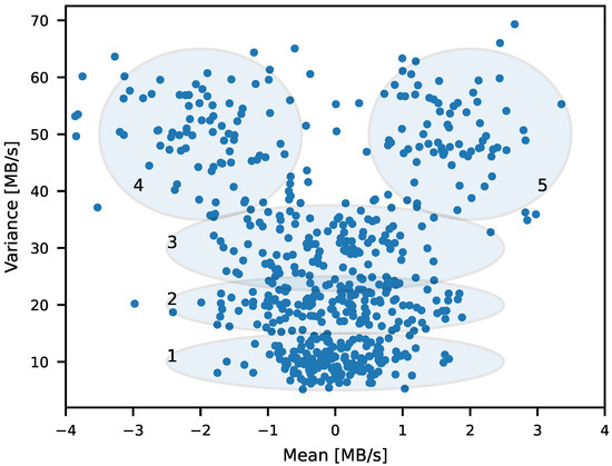 Figure 5 presents feature clusters identified by KMeans and extracted from a fragment of the M2 trace. The x-coordinates represent the mean feature, while the y-coordinates represent the variance feature. The groupings have a Y shape. The clusters labelled 1–3 depict traffic fluctuations of different amplitudes—from the smallest ones in cluster 1 to the medium ones in cluster 3. Clusters 4 and 5 describe major increases or drops in the throughput with a non-zero mean change and high variance.