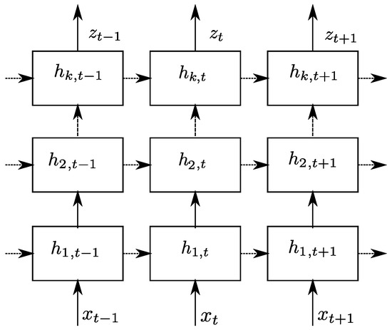Figure 6. This allows memory cells to store data over long periods of time, making them particularly useful in time series prediction with long temporal dependency. Multiple memory blocks form a hidden layer, and an LSTM model typically consists of an input layer, at least one hidden layer, and an output layer. Deep LSTM architectures with multiple hidden layers can create increasingly higher levels of data representations due to their greater capacity. In this architecture, multiple hidden layers are stacked in such a way that the subsequent layer takes the output of the previous LSTM layer as its input; see