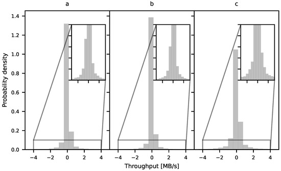 Cellular system operation has diverse characteristics that depend on the specific network deployment details, e.g., antenna heights or cell numbers in an area. Furthermore, the geographical environment also impacts the system. For example, in a city, radio waves are more obstructed by infrastructure than in rural areas. These factors can contribute to unique properties in the collected network traffic. Therefore, we also conducted measurements of a 5G system. For the collection of the network throughput data, we employed G-NetTrack Lite. This is a network monitor and a test tool for mobile networks that runs on a smartphone. To obtain the throughput, we repeatedly downloaded from a server a 1 GB file. The large file allowed the TCP sending window to extend to its maximum size. The network monitor logged the throughput with 1 s granularity. In the case of the mobile scenario, denoted as M2, we drove a car between multiple locations separated by an average distance of 2 km. In each location, we stayed for a random time interval, with an average duration of 5 min. This simulated a typical bus or car drive in an urban area with crossroads, traffic lights, traffic jams, and bus stops. We captured the traffic, and after data cleaning, we had 600 min for a fixed scenario and another 600 min for a mobile one.