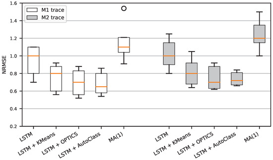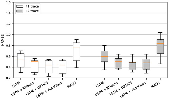 Figure 10. The error achieved by the LSTM model trained on the whole continuous traces was moderately higher than that of the specialized LSTM models. The MA(1) error was the highest. The results were similar regardless of the applied clustering algorithms. However, a closer examination of the results showed that KMeans obtained a slightly worse score than the remaining two groupings.