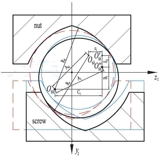 When the nut is subjected to a load, the relationship between , , , and the deformation and equivalent deformation can be calculated through Figure 2 by Equation (9). In addition, it can also be derived that . Because ball screws usually use Gothic raceway, and the elastic deformation of the screw and the nut is much smaller than their structural parameters, the contact angle does not change much before and after the load is applied [20].