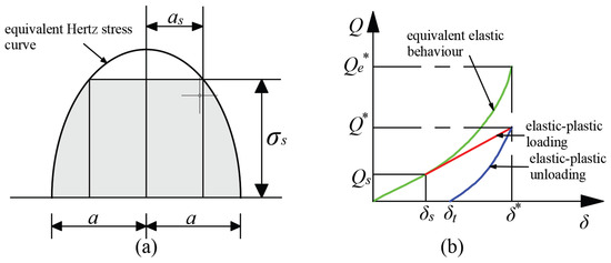At the unloading point , the stress shadow governed by the equivalent elastic contact load is the same as the stress shadow determined by the contact load . Because of the permanent plastic deformation of the surface, the equivalent elastic contact radius is smaller than the equivalent plastic radius. Therefore, can be expressed as Equation (28) [12]. Then, the numerical solution of can be obtained by combining Equations (26)–(28).