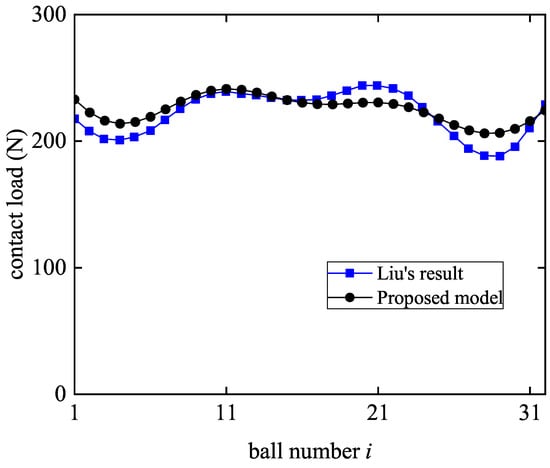 Equations (12) and (13) together form a set of nonlinear equations f, and can be numerically solved by Newton’s iteration using Equation (14) to obtain the contact loads of each ball, where is the solution of the contact load at the r-th iteration, J is the Jacobian matrix of the nonlinear function f, and the iteration ends when .