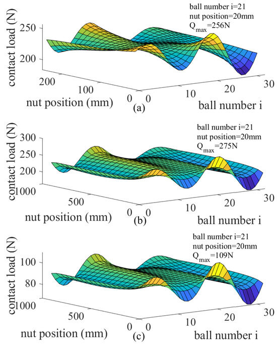 Taking the nut raceway as a reference, the equivalent axial deformation and radial deformation can be calculated by Equations (6) and (7), where is positive towards the positive side of the axis, and is positive in the positive direction of the axis [20].