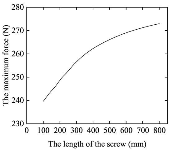 Figure 6 shows the effect of the screw length on the static load. Assuming that the ball screw has no preload, the maximum load borne by the ball at different screw lengths is calculated. As the screw length increases, the maximum load borne by the ball also increases. This is because the longer the screw, the more easily it deforms under axial force, which results in an increase in the unevenness of the load borne by the ball.
