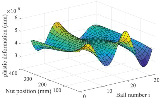 Figure 7 shows the plastic deformation of the position when each ball contacts the ball screw raceway under different nut positions. It can be seen that the raceway’s plastic deformation changes with the nut position and the ball serial number due to the uneven stress of the ball.