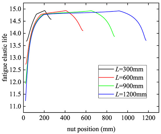 The fatigue elastic life of ball screw under different nut positions and screw lengths.