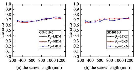 The ratio of the nut position to the screw length under different parameters. (a) GD4010-6; (b) GD4016-5.