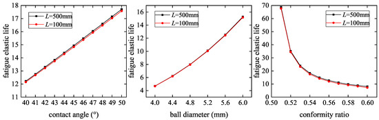 Figure 11 shows the maximum fatigue elastic life of ball screws under different contact angles, ball diameters, and conformity ratios when the lead screw length is 100 mm and 500 mm, respectively. The influence of ball screw parameters on the maximum fatigue elastic life under different lengths is the same. The fatigue elastic life increases approximately linearly with the increase of contact angle, but the effect is insignificant. With the increase of ball diameter, the fatigue elastic life increases, and the influence of ball diameter is larger. The fatigue elastic life decreases with the increase of the conformity ratio. Moreover, when the conformity ratio is small, its influence on the fatigue elastic life is very obvious. Therefore, selecting a larger ball diameter and a smaller conformity ratio can significantly improve the fatigue elastic life of the ball screw.