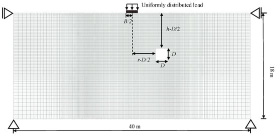 Figure 1 depicts the typical soil model utilized in this study, featuring the footing and cavity system. In the scenario examined, a shallow foundation with a width denoted as B is placed on the ground with a cavity. The foundation is subjected to uniform vertical loads in homogeneous soil under plane strain conditions. The uniform load is applied to the foundation base, and the foundation is not embedded. The soil characteristics include the cohesion c, the shear resistance angle ϕ, and the unit weight γ. The cavity’s shape is square and circular (though it is worth mentioning that the circular configuration is not illustrated here) in the homogeneous soft soil material. To mitigate boundary effects, the model’s boundaries are selected to be sufficiently large. The dimensions of the model are specified as a width of 40 m and a height of 18 m. Vertical displacements are exclusively permitted at the lateral boundaries. At the bottom horizontal boundary, displacements in the horizontal and vertical directions are strictly restricted. Two crucial distances are defined in the context of the cavity: h (m), representing the vertical gap between the ground surface and the cavity’s center, and D (m), denoting the diameter of the cavity (applicable for a circular cavity as well). Additionally, r (m) is the horizontal distance between the centerlines of the cavity and the footing. This study assumes that the cavity remains unsupported and statically stable under its self-weight. For enhanced accuracy in the solution, the mesh sizes are deliberately finer around the footing base and the surrounding area. Notably, the cavity’s location varies for each analysis case.