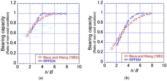 Comparison of the variation of the bearing capacity with the depth to cavity obtained by RPFEM and the study by Baus and Wang [8]. (a) D/B = 1; (b) D/B = 2.