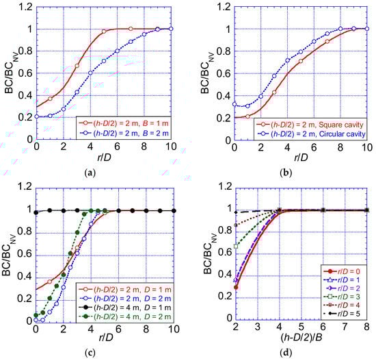Effects of different geometrical parameters on the normalized bearing capacity BC/BCNV. (a) Footing width (for cases B = 1, 2 m; D = 1 m); (b) cavity shape (for cases B = 2 m; D = 1 m); (c) cavity size (for cases B = 1 m, D = 1, 2 m); (d) cavity depth (in case B = 1m).