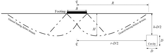 The analysis of the bearing capacity under several conditions considering different geometrical parameters and soil types (cohesive soils, intermediate soils) is investigated. This study elucidates the correlation of the influence zone by introducing a novel normalization concept based on the boundaries of the footing’s failure surface. These boundaries are established in both horizontal and vertical directions within the ground without cavity, as depicted in Figure 4. The failure surface beneath the footing is conceptualized with three zones, as documented in the literature [25,27], specifically applicable to homogeneous soil subjected to vertical loading. The lateral expansion of the failure domain primarily depends on the shear resistance angle.