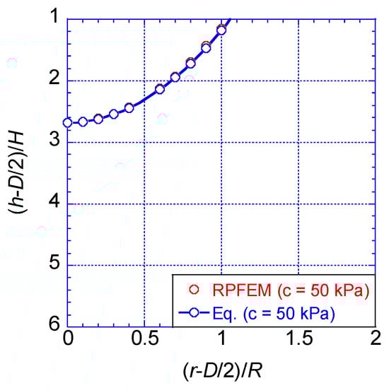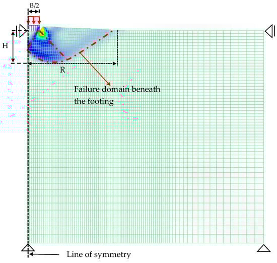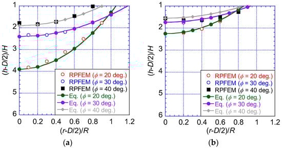 The newly introduced normalization parameters are the dimensions R and H. Table 3 shows the parameters R and H for the various types of ground without the cavity obtained by the RPFEM results. It is worth noting that these values are empirically obtained from the results of simulation with RPFEM on deformation analysis of footing on the soil without voids (Figure 5). As a reference, empirical determination of the plastic mechanism or failure surface has been used to determine failure domains in the case of total and effective stress analyses [23,26].