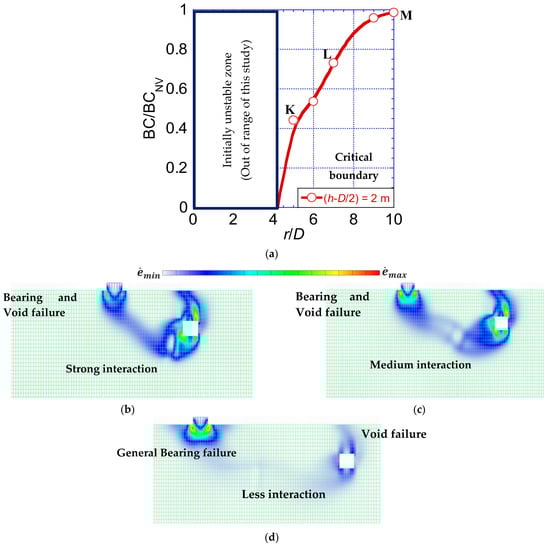 The analysis of BC/BCNV for the footing-cavity system is conducted in cases involving cohesive soils. Figure 6a shows the variation of BC/BCNV with r/D for a cohesive soil material (c = 10 kPa). The results exhibit a single line, visible only for the scenario of a shallow cavity within the range r/D = 4 to r/D = 10. It is noteworthy that the value of BC/BCNV barely reaches unity along the horizontal axis. This is attributed to the dominance of shear stress induced by the soil unit weight around the cavity over cohesive resistant forces. In particular, the range between r/D = 0 and r/D = 4 is an initially unstable area and is out of the target of this study. Figure 6b–d shows the failure mechanism for a cavity at the points K, L, and M, respectively. The strain distributions reveal a general shear failure at the footing base and roof failure at the cavity with an extension of relatively small strain between the footing and the cavity. In addition, the closer the footing and cavity are, the stronger the interaction inducing the void and bearing failure (Figure 6b,c).