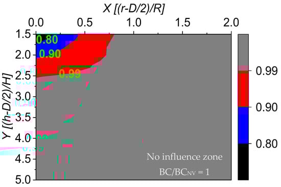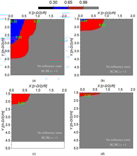 These parameters exert significant influence by governing the development of the failure mode in the footing-cavity system. When the cavity lies outside the failure domain, i.e., when (r-D/2) > R and (h-D/2) > H, its impact on the footing’s performance diminishes with increasing distances of (r-D/2) and (h-D/2). Conversely, critical failure modes emerge when the cavity is situated within the footing’s failure domain. Consequently, the results are presented as the distribution of BC/BCNV within the plane of normalized distances, with (r-D/2)/R representing the X-axis and (h-D/2)/H for the Y-axis, respectively.