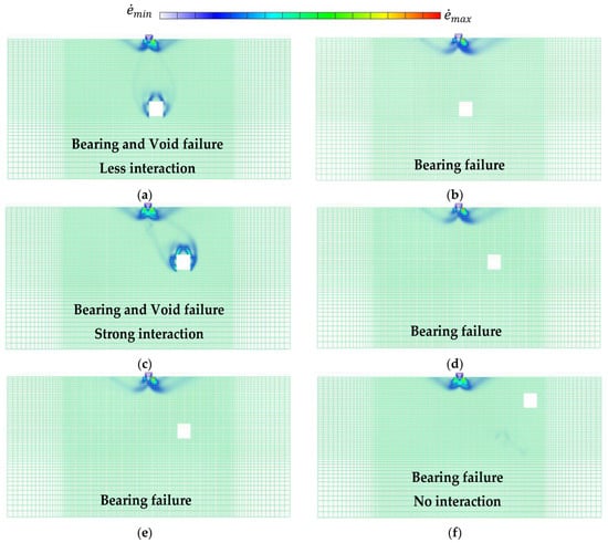 Figure 9a,b displays the failure modes for the cavity located at the depth (h-D/2) = 8 m and the horizontal distance r = 1 m. The condition case in Figure 9a (Bearing and Void failure) shows that the strain rate is also concentrated at the cavity wall (lower parts). The farther the cavity exists horizontally, the less the interaction between the footing and the cavity occurs. Figure 9b shows that for the identical geometrical conditions with Figure 9a, a change of the failure mode in the case only ϕ is higher is observed. The change of failure to the Bearing failure is remarkable as opposed to Figure 9a. This is due largely to the value of H of the failure domain generated considering this typical shear strength. The failure mechanisms are in agreement with those obtained by Zhao et al. [15] who discussed the bearing capacity and failure mechanism of a rough strip footing located above the cavity by introducing a method that considers random and complex shapes based on an Inverse Discrete Fourier Transform (IDFT).