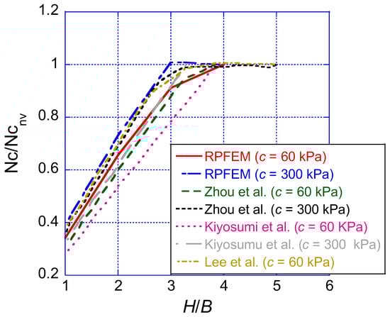 Comparison between Nc derived from RPFEM and that of previous studies [18,28,29] (c = 60 kPa and c = 300 kPa).