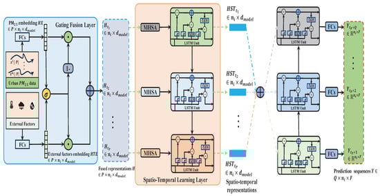 Figure 2. The architecture of the local ESTNet deployed on the ECS i. First, fully connected networks (FCs) are adopted to transform urban P M 2.5 and external factors into H X P × n i × d model and H T E P × n i × d model , respectively. Then, the gating fusion layer is utilized to fuse these two features, which is represented as H P × n i × d model . Here, the fused feature at timestep t j is H t j n i × d model . Furthermore, a spatio-temporal learning layer is proposed to mine spatio-temporal correlations and the output representations of timestep t j are H S T t j n i × d model . Finally, we leverage the decoder of seq2seq joint FCs to produce the prediction sequences, where Y t P + k n i × F denotes the predicted value of n i sensors in the urban region i at the predicted timestep t P + k . In addition, ⊙ is a dot product. σ and t a n stand for the activation functions s i g m o i d and t a n h .