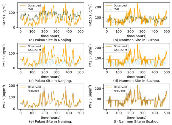 Figure 4. P M 2.5 Prediction results with the comparison models. (a) SVR for Pukou site of Nanjing city, (b) SVR for Nanmen site of Suzhou city, (c) GAT-LSTM for Pukou site of Nanjing city, (d) GAT-LSTM for Nanmen site of Suzhou city, (e) FedDeep for Pukou site of Nanjing city, and (f) FedDeep for Nanmen site of Suzhou city.