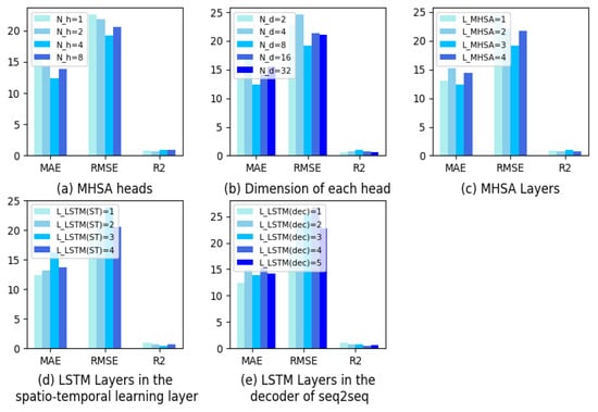 Figure 5. Experimental results for different hyperparameter configurations. The vertical axis represents the values of MAE, RMSE, and R 2 .