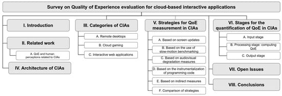 The remainder of this paper is structured as shown in Figure 1. Section 2 reviews related works and addresses human perceptions of users and their influence on the CIA’s QoE. Section 3 presents the categories of CIAs and how the state-of-the-art proposals focus on each of them. Section 4 details the characteristics of the CIA’s infrastructure and the different location possibilities for QoE monitoring tools. Section 5 groups the literature proposals into the main strategies used to measure QoE in CIAs. In this section, we detail how each proposal derives its measure of QoE. Section 6 outlines the three stages these strategies must go through for QoE assessment. Finally, Section 7 explores open issues, and Section 8 concludes this paper.