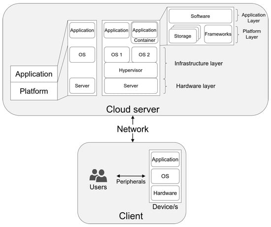 The third and last component is the cloud server. In [83], the server is divided into four subcomponents: hardware, infrastructure, platform, and application. The hardware layer of the cloud server is similar to the hardware layer of the client, and therefore, the metrics are similar. One of the features that the cloud offers is the flexible use of hardware resources. Cloud server providers select different strategies to take advantage of physical computing resources. They may virtualise the hardware using a hypervisor, running different operating system instances on the same computer at the same time. Service providers may adapt the number of virtualised instances depending on demand. The hypervisor is a component of the architecture that researchers utilise to obtain measurements related to its performance, such as the use of computational resources or the number of virtualised OSs.