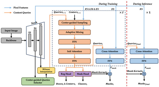 For the updated queries and pixel features , we used regression and segmentation heads to predict the segmentation results and center point positions. Specifically, our regression head predicts center point offsets and instance scales from the queries through a feedforward network. The segmentation head generates segmentation mask weights from the queries and predicts instance categories. Finally, the instance segmentation result was computed by applying the segmentation mask weights to the pixel features.