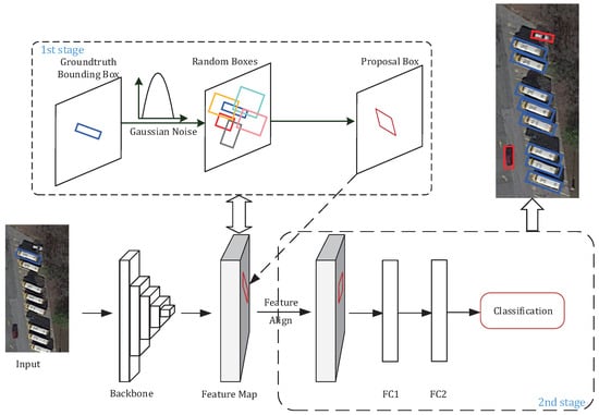 Object detection of remote-sensing images is a basic but challenging task in computer vision [,,,]. Most existing object detectors rely on prior knowledge and candidate boxes to perform regression on detection boxes [,,]. These candidate boxes help simplify the object detection task by providing initial bounding box proposals. In contrast, our proposed method for object detection in remote-sensing images utilizes a diffusion model generation task. This approach enables the direct detection of object boxes from a set of random boxes. Essentially, the task of detecting the position (center coordinates) and size (width and height) of the bounding box is treated as a generative task within the object detection framework.