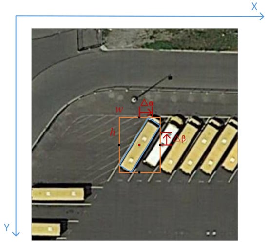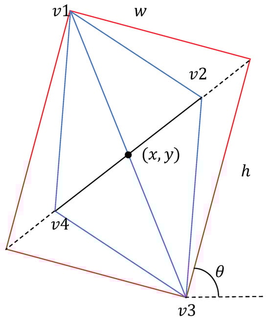 To account for the diverse orientations of objects in remote-sensing images, we propose a oriented box representation method to utilize the box representation. To represent the position of each oriented anchor box, we employ six regression parameters, namely, . Among these parameters, represents the center coordinate of the outer rectangle of the oriented box, while w and h imply its width and height, respectively. The parameters and denote the offsets of the top edge and right midpoint of the outer rectangle of the oriented box.