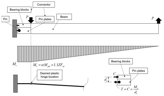 In the design of the speedBridge, a capacity design concept was adopted, such that the connection parts were designed to exhibit strength and stiffness comparable to or exceeding those of a beam without a hinge connection. Therefore, the moment resistance at the section where the pin exists needs to exceed the design plastic moment of the beam such that (see Figure 2)