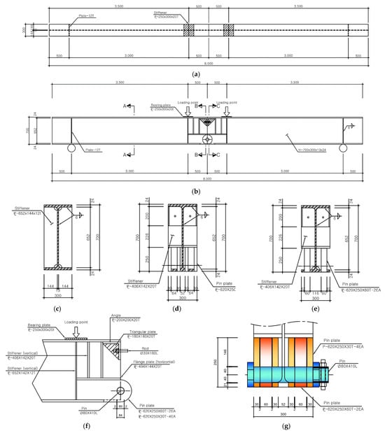 The overall view and details of the test specimen are shown in Figure 4. The total length of the beam was 8 m, the clear span was 7 m, and the distance between the loading points was 1 m (see Figure 4a,b). The flange and web of the beam, bearing blocks, and pin plates were made of SS275 steel, and the pin was made of SM45C steel. To prevent local buckling before reaching the ultimate strength, the beam was designed as a compact section (H-700 × 300 × 13 × 24). To prevent web crippling or local web yielding, stiffeners with 12t plates were welded to the support and at loading locations (see Figure 4c). Figure 4d,e show the sections for the female and male connectors, respectively. In these connectors, four plates of 30 mm thickness and two plates of 60 mm thickness were placed in the lower part of the connectors. To provide compressive forces, angle elements were located in the upper parts of the connectors, and the faces for bearing were connected with threaded rods (see Figure 4f). The detailed configuration of the connector is graphically shown in Figure 4g. Based on the design procedure specified in Section 3.1, the design strengths for the connector parts were calculated as summarized in Table 2. It can be stated that the governing failure mode is the longitudinal shear rupture of the pin plates.