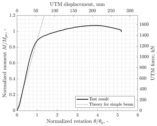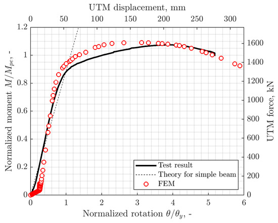 Figure 12 compares the moment–rotation relationship from the test result with that from the FEM result, superimposed. This figure shows that the FE model used in this study has sufficient accuracy to describe the overall experimental results. In the case of the analysis model, a sudden slip appears immediately at the beginning when the pin is in contact with the pin plates. For the subsequent behavior, the FE model exhibits greater stiffness than the experimental results; however, the overall strength is consistent. Strain data were also compared with the measurement values, which showed that the strain data measured in the pin plates remained in the elastic state at the measurement points, as intended in our design. Similarly, for the strain measured in the lower flange of the beam, we were able to obtain plastic deformation beyond the elastic limit as intended.