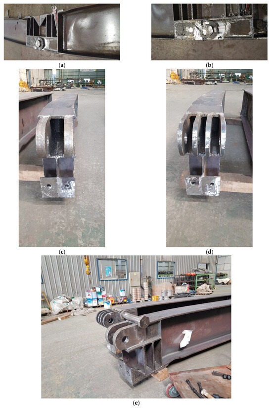 Figure 5 shows the manufacturing process of the test specimen. First, the upper and lower flanges of the entire girder were cut to fit the size of the bearing plate and hinge connection parts. Subsequently, the plates required for the bearing blocks and pin plates were cut as designed, and the male and female connectors were designed. After the girder flange part of the hinge connection structure was welded, the girder web was cut to complete the segmented girder connection. Specimens were cut with a laser only from the flange of the H-beam steel (SS275) used to manufacture the specimens. The stiffeners were welded to the beam in a shop by a commercial fabricator.