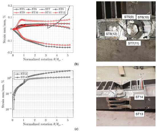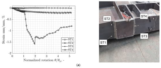 A total of 14 strain gauges were attached to the specimen surface to elucidate the overall behavior. Strain gauges labeled 1 to 4 were attached to the upper flange of the center of the beam, of which ST1 and ST2 were attached 10 cm away from the load point in the beam direction, and ST3 and ST4 were attached to the center of the connector where the bearing block was located. Figure 9a shows that the strain rate of ST2 changed rapidly owing to yield at the yield rotation angle and subsequent flange buckling, whereas, in ST1, no significant strain was observed during the experiment. This is presumed to be the effect of the torsion of the specimen in the process of manufacturing and loading the specimen. In the case of the upper flange of the beam at the upper part of the bearing block, yield strain was observed. However, as buckling was prevented by the side stiffeners of the block, no strain could exceed the yield strain.