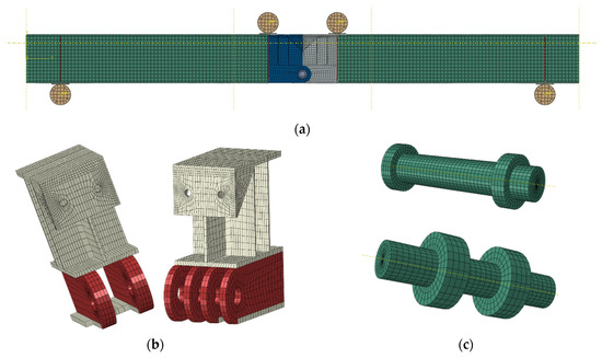 FE model used in the analysis. (a) Overall; (b) Male connector (left) and female connector (right); (c) Upper pin (top) and lower pin (bottom).