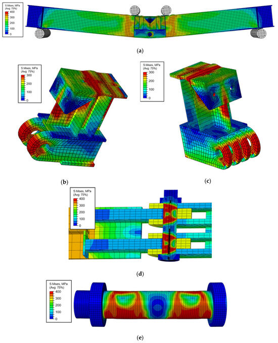 When considering the failure modes calculated in Table 2, the shear failure of the pin plate and the shear failure of the pin were the primary concerns. As anticipated, stress concentrations along the longitudinal direction of the pin plates and at the point where shear occurs in the pin were observed. Figure 13 illustrates the stress distribution based on the FE results. As depicted in Figure 13a, a plastic hinge forms where the beam is connected outside the connecting part. Additionally, within the connector parts, the applied moment at the mid-span of the beam is countered by stress concentration on the lower part of the pin plates and the upper part of the bearing blocks. Figure 13b,c detail the stress distributions of the male and female connectors, respectively. In the case of the bearing block, compressive stress is efficiently transferred to the upper flange of the beam through the upper flange and the web of connectors. Regarding the pin plates, both the male and female connectors withstand tensile forces, transferring stress from the periphery of the pin to the lower flange. Figure 13d presents a cross-sectional view of the connection between the pin plates and the pin, demonstrating the flow of stress at the junction. Figure 13e displays the stress distribution of the pin, revealing high stress levels around the surface in contact with the pin plates, although no significant damage was observed.