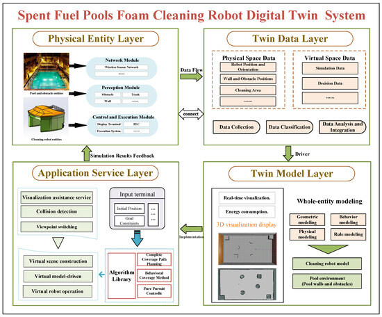 The TWL serves as the foundation of the digital twin system, responsible for managing and processing physical data, acting as a bridge between the physical and virtual spaces, and allowing their mutual influence. Its functions primarily include classifying, analyzing, and integrating real-time physical data from sensors such as lidar, depth cameras, and ultrasound arrays. This encompasses both physical space data and virtual space data, with physical space data including the robot’s position and orientation, the positions of walls and obstacles, and the cleaning area. Virtual space data include the simulation and decision data. Finally, these data are transmitted to the application service layer for further processing.